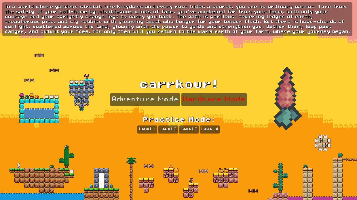 carrkour is a 2D platformer game developed in Godot. The premise is simple: you (a carrot) must parkour through the rabbitlands to get back home, where your vegetable and animal family awaits you. Each level, you have to collect ten Suns and offer them to the Gate, who will let you progress through the realms. Following the footsteps of many great platformers, this game is meant to be beaten through trial, error, and many deaths :)