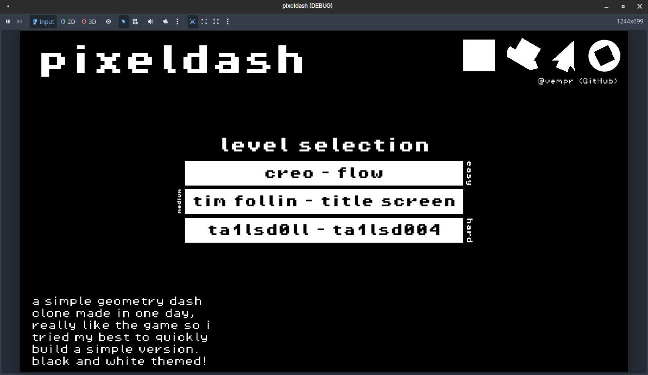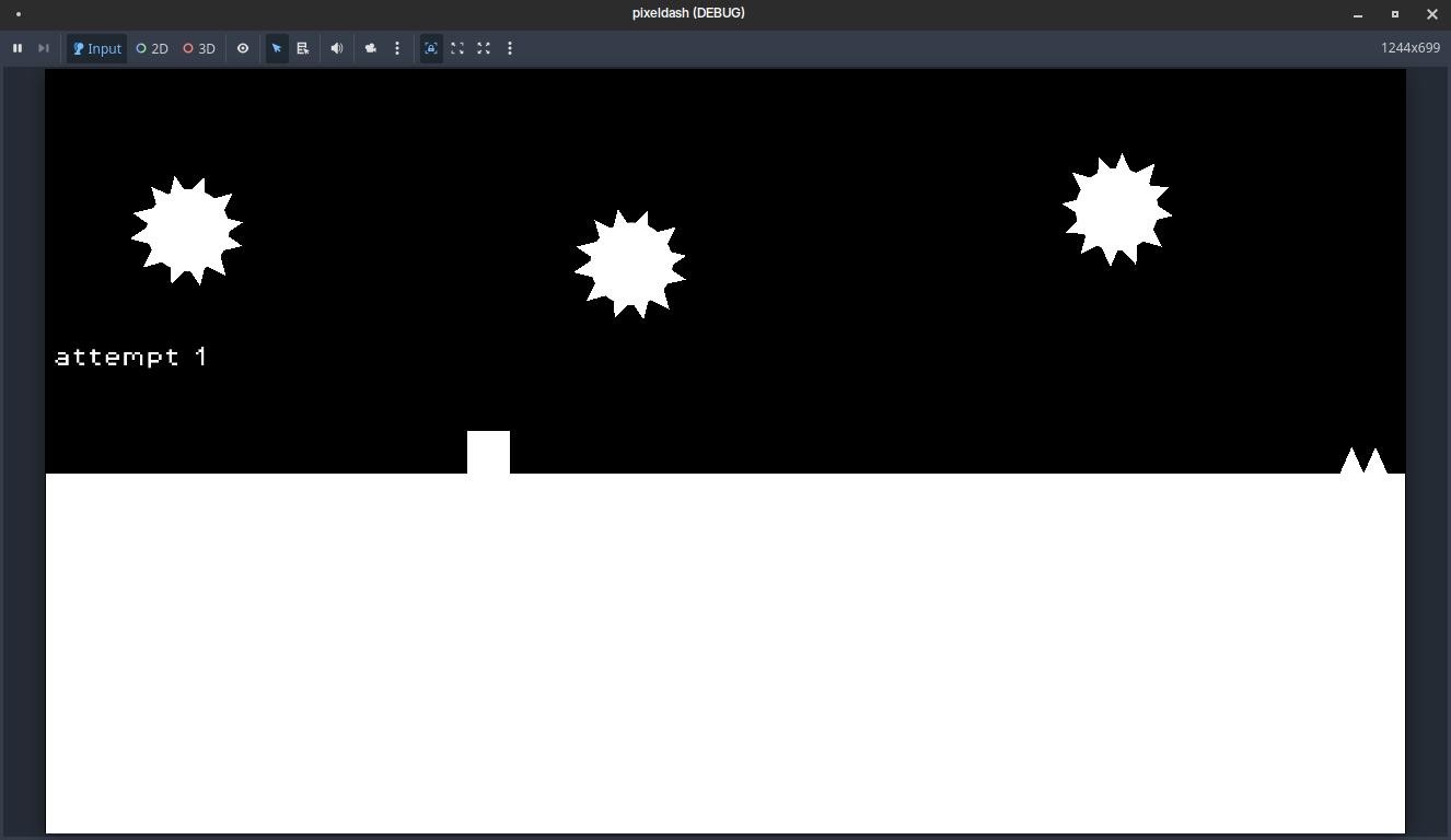 a simple geometry dash clone made in one day, really like the game so i tried my best to quickly build a simple version. built in 10 hours for my final Siege submission!