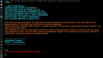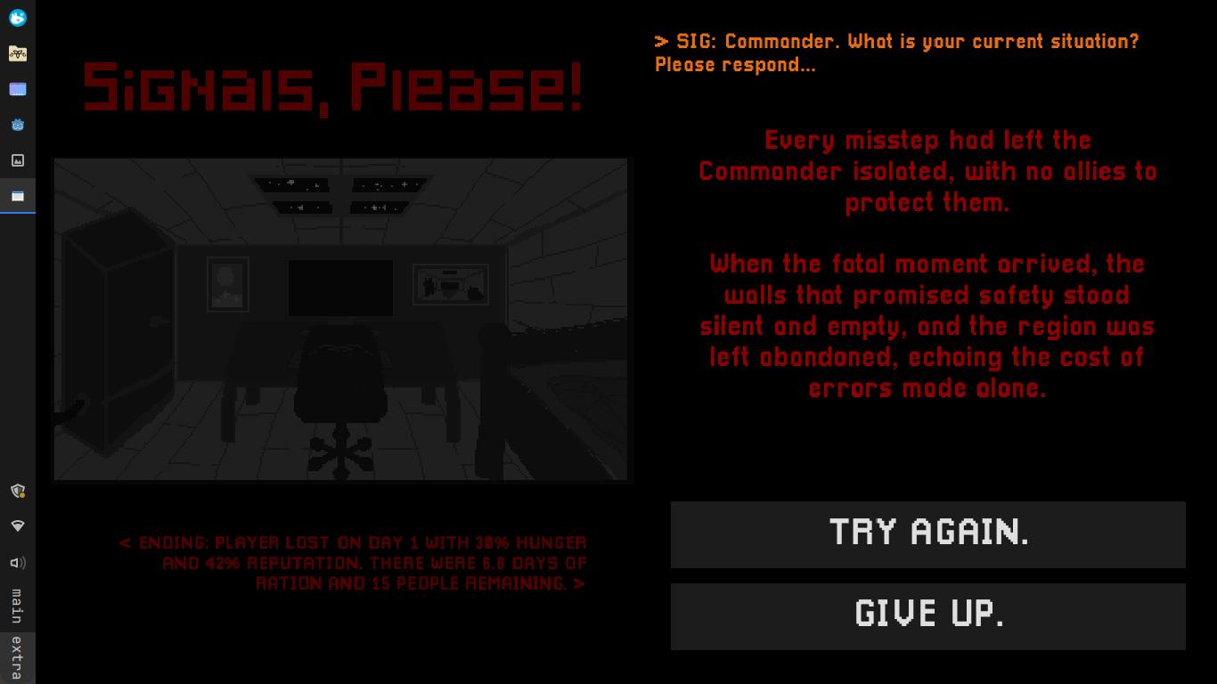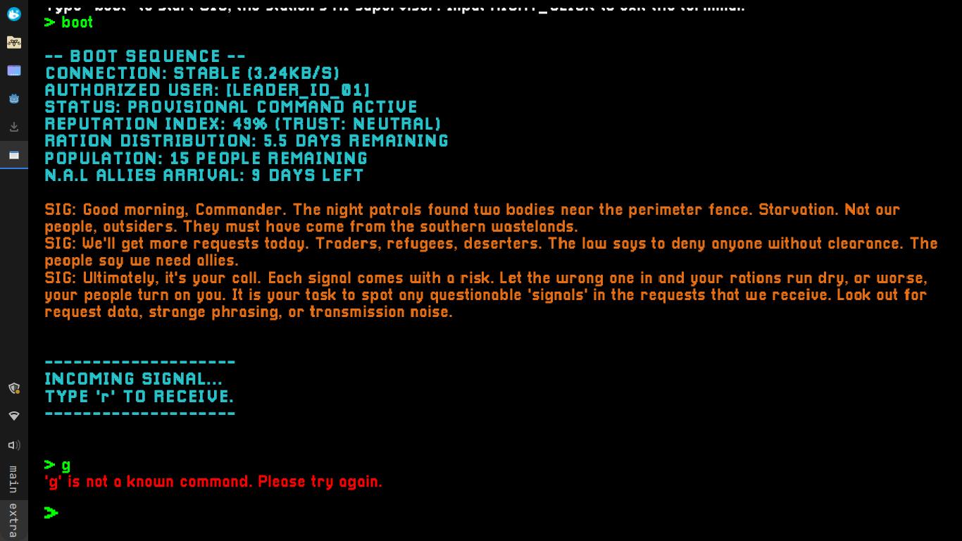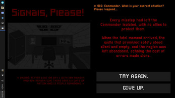 Signals, Please! is a game made in Godot. Your role is the commander, the sole leader of the last functioning outpost after the network collapse. All external contact comes through your Signal Terminal and for every incoming request, you must decide whether or not to trust them.
